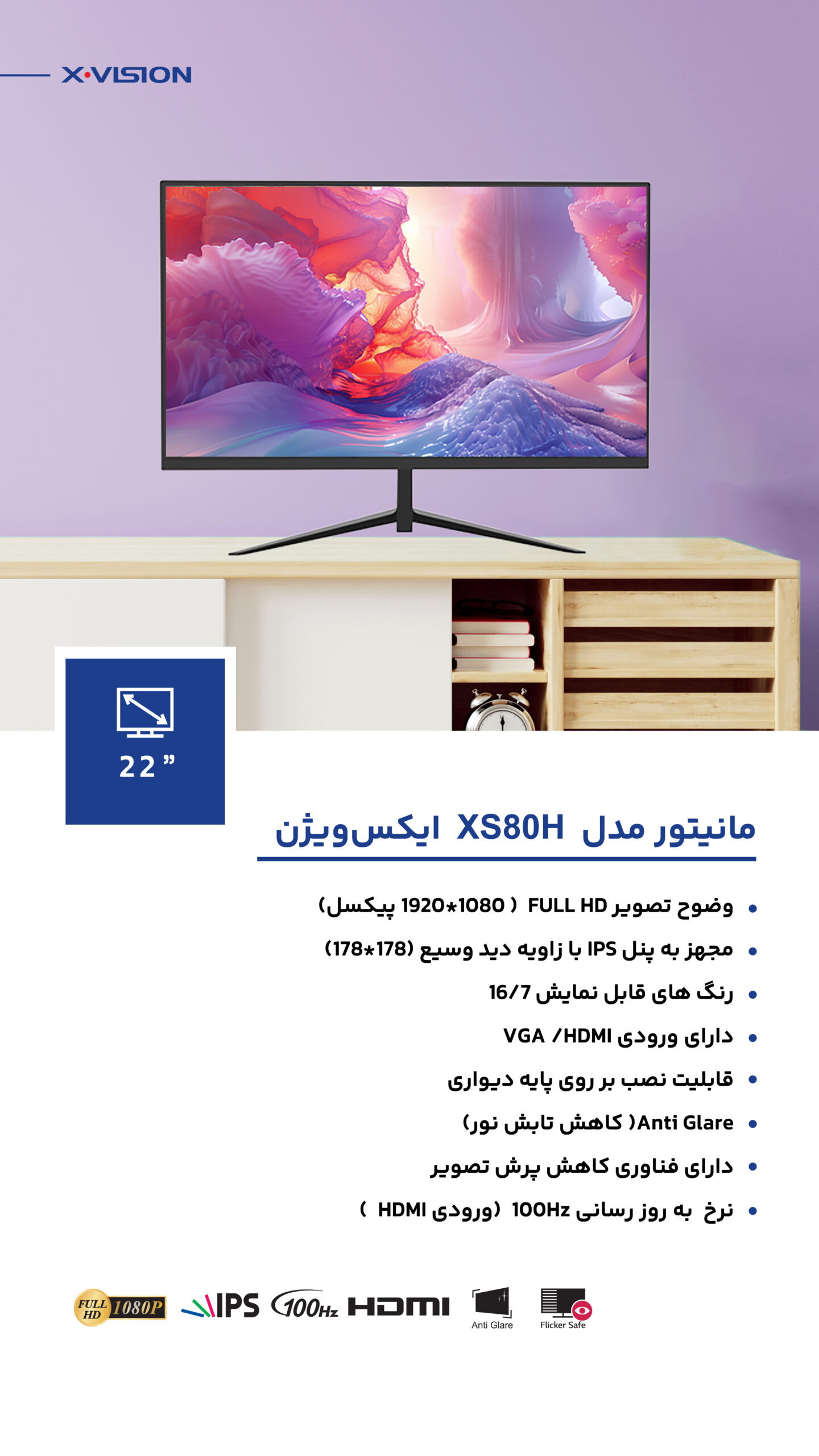 مانیتور ایکس ویژن مدل XS2280H یک مانیتور 22 اینچی با وضوح تصویر FULL HD است. ابعاد صفحه نمایش این مدل و وضوح تصویر بالا، این مانتیور را برای کار ظریف و حساس طراحی بسیار مناسب کرده است. همچنین دارای درگاه VGA و HDMI است.